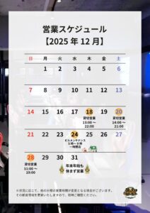 貸切営業・ビルメンテナンスの日時12月18日(木) 13:00 ~ 22:0012月20日(土) 14:00 ~ 21:0012月24日(水) 5:00 ~ 9:0012月28日(日) 11:00 ~ 19:00※他日程の営業時間が変更となる場合がございます都度情報を発信いたしますのでご確認下さい
